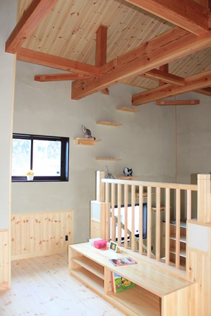 スキップフロアからの吹き抜けは、かわいい猫ちゃんのため、キャットウォークを取り入れ、運動不足解消、落ち着ける場所にもなりますね。