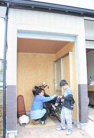 ビルトインガレージ 趣味のバイク。休みの日にはこのガレージでバイクのお手入れや修理ができます。