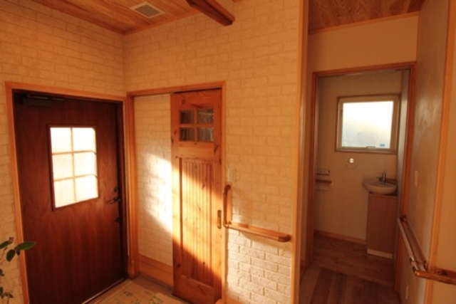 【玄関】 レンガ調のアクセントの塗り壁でお客様をお出迎え