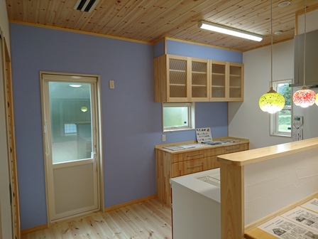 【キッチン】 淡いブルーがアクセントのキッチン。そして手作りキッチンボードも