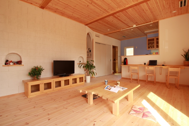 【リビング】 無垢材・自然素材をふんだんに使ったリビング。TV側の壁には石積み調のアクセントでワンポイント