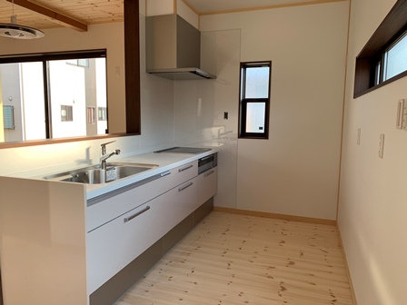 【キッチン】 動きやすい広々キッチン。 高い所に窓を配置することで暗くなりがちなキッチンを明るく。