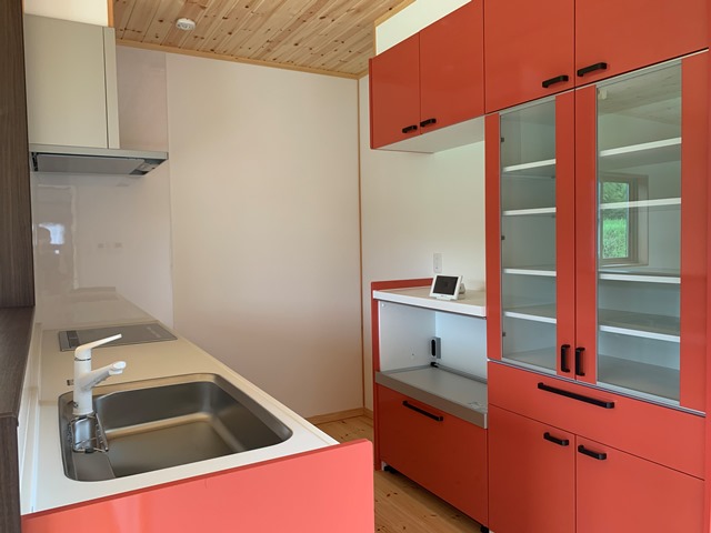 【キッチン】 キッチン・カップボードのコーラルピンクがかわいいですね。