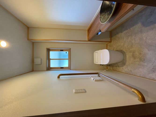 【1階トイレ】 一枚板のトイレカウンターに信楽焼の手洗いボール