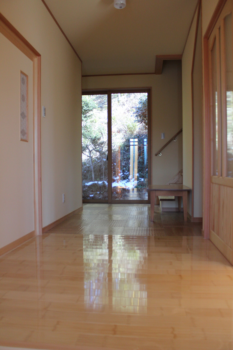 玄関扉を開けると竹材を 使った玄関ホール廊下には カバ材