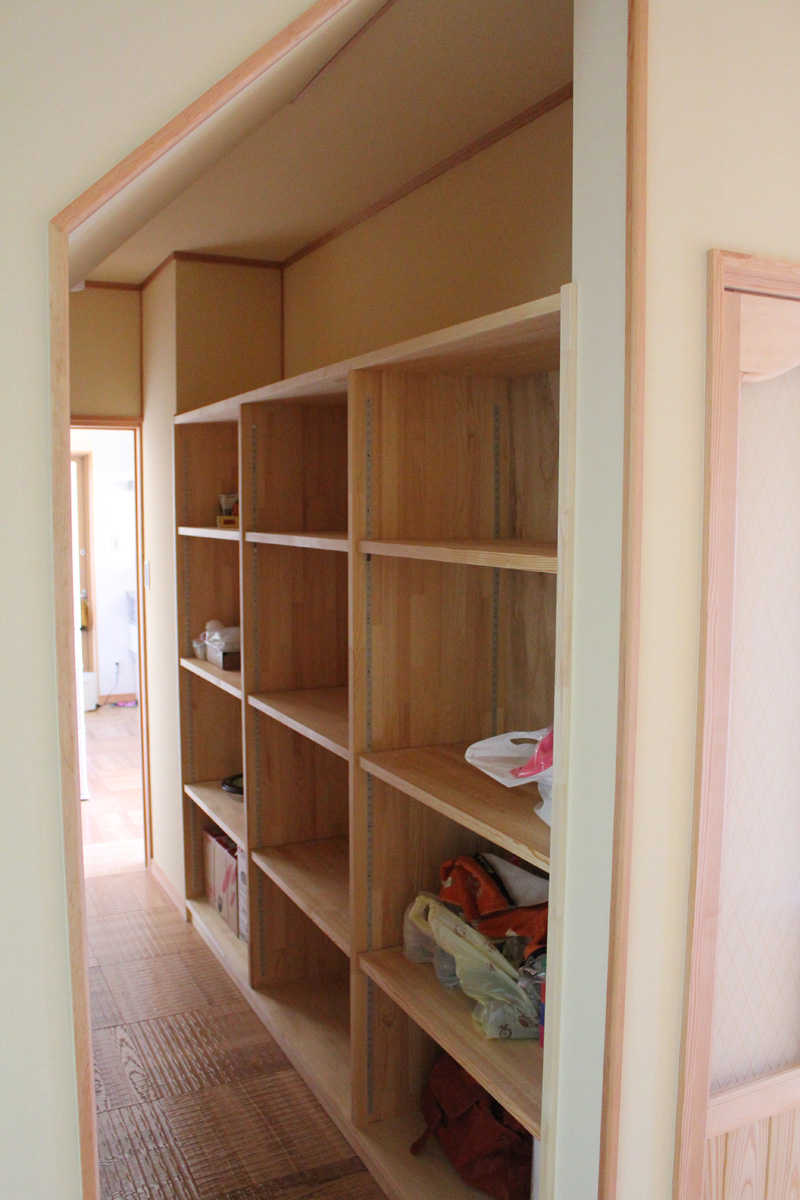 大きな収納棚玄関ホールからキッチンへの通り道にあるので買い物してそのまま収納ができます。