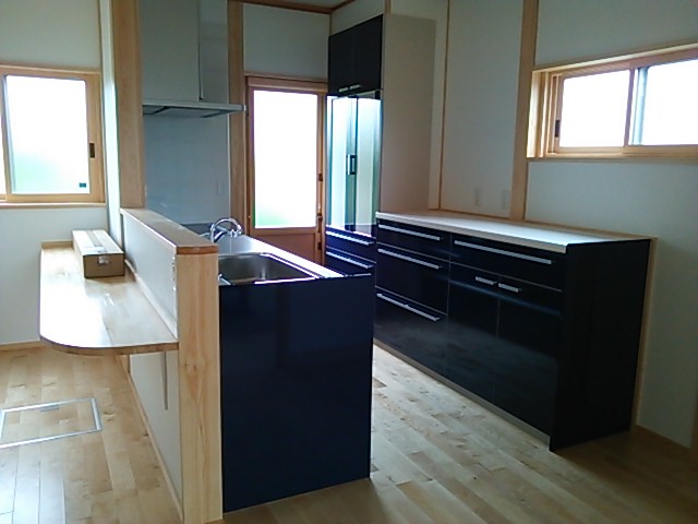 キッチン 床材にはカバ材を使用。 落ち着いた色のキッチン。 おばあさんとお母さんとお孫さんと作るご飯が楽しみですね