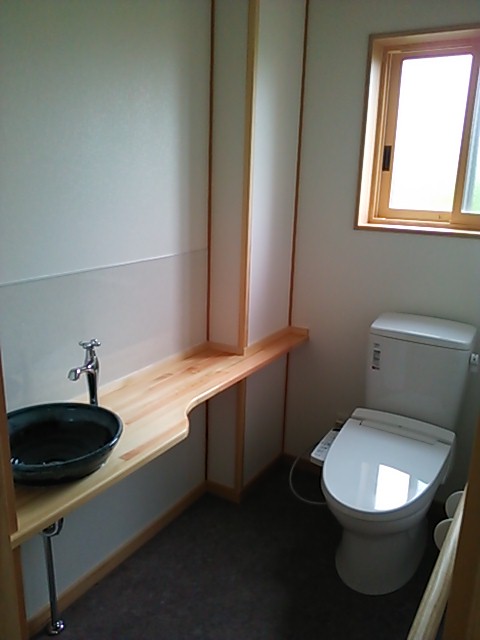 トイレ 信楽焼きの手洗いボール。 ダークトーンの床が落ち着いた空間を演出してくれます。