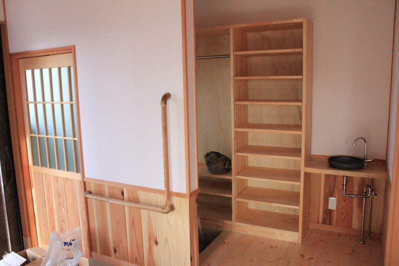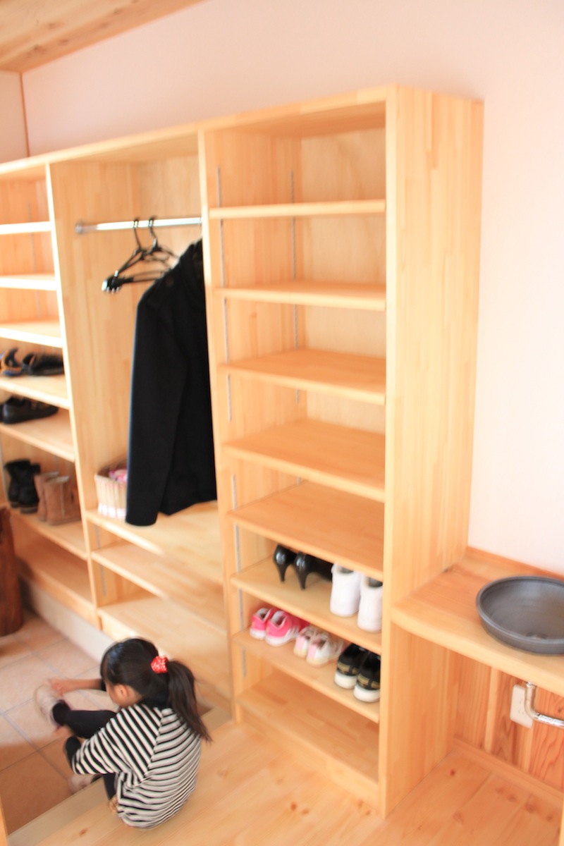 二世帯だから玄関入ると仕切られているシューズクローゼット。 隣には帰宅したらすぐに手洗いができるスペース。