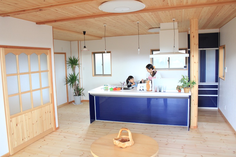 赤松の床材に紺色のキッチンがとても素敵。家族みんなでの食事が楽しくなりそう!