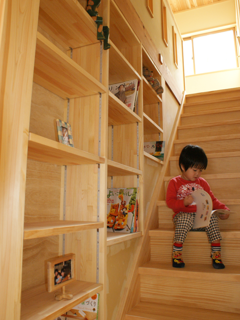 階段壁には家族全員でつかえる職人手づくりの収納棚
