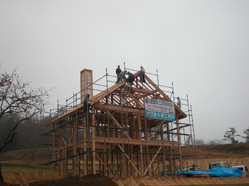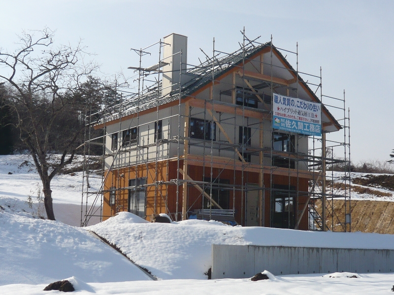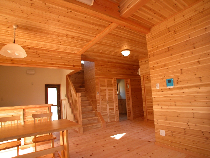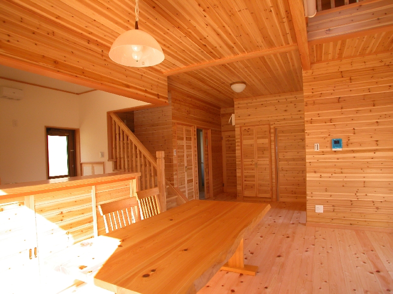 秋~冬~春にかけての施工をさせて頂いたS様邸。丸森の自然の中に山小屋風のお家。内装はもちろん、無垢の杉をメインに使い、外装のウッドデッキ、バルコニーにも無垢の木をアラワシで使用しました。 施工中には、雪の水がとける音や、春には鳥の声が聞こえ、自然の方からお話をしてくれているような雰囲気があります。