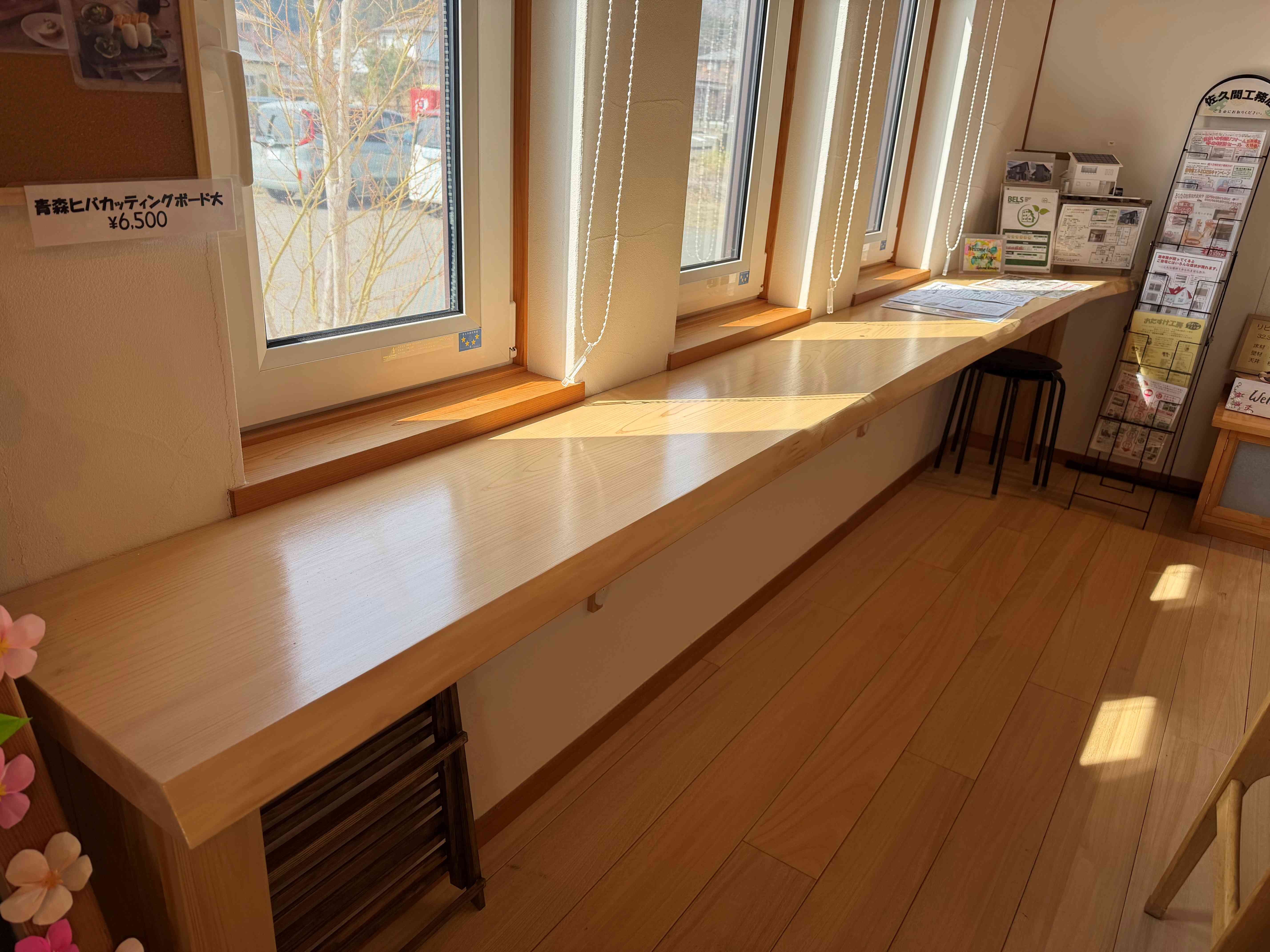 窓際に天然木「ひのき」の一枚板のカウンターです。